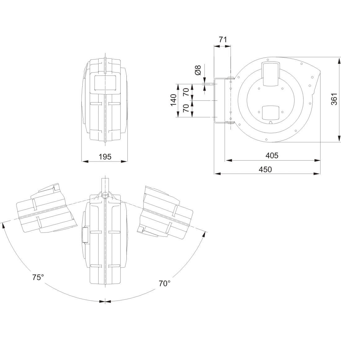 Aplicación: guardar mangueras y transportar aire comprimido. Soporte de acero que gira 145º